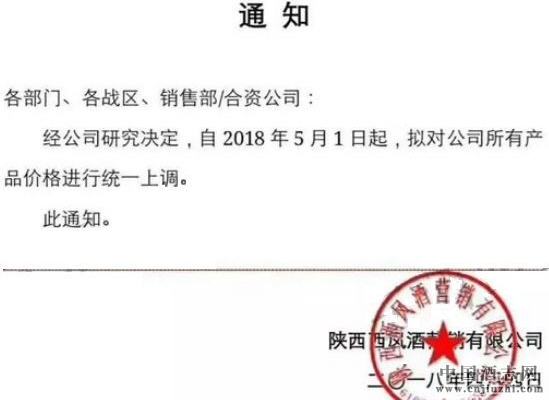 4月9日,獲悉一份“陜西西鳳酒營銷有限公司提價(jià)通知”。通知顯示,自2018年5月1日起,擬對公司所有產(chǎn)品價(jià)格進(jìn)行統(tǒng)一上調(diào)。