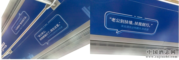 地鐵營銷首要的就是對目標群體的情感洞察,這些人是不是你的目標受眾?他們喜歡什么?又會被什么樣的內容所觸動?是地鐵營銷的靈魂三問。百年糊涂藍純的地鐵營銷除了洞察古天樂、粵語、年輕人與產品自身的聯系,同時還從更深層的兩性情感領域挖掘用戶背后關于“酒”的故事——酒后夫妻語錄。白酒的主要消費群體為步入社會的男性,其中以成家、有戀人的青年沾大多數,酒后夫妻語錄正是以簡短有力的對話,觸動了這些目標人群的內心情感。這些人群或多或少都經歷過類似的場景,因此在看到酒后夫妻語錄時,除了會心一笑,更能感受到百年糊涂不僅僅是賣酒,更是在真實記錄傳達那些屬于酒的故事。